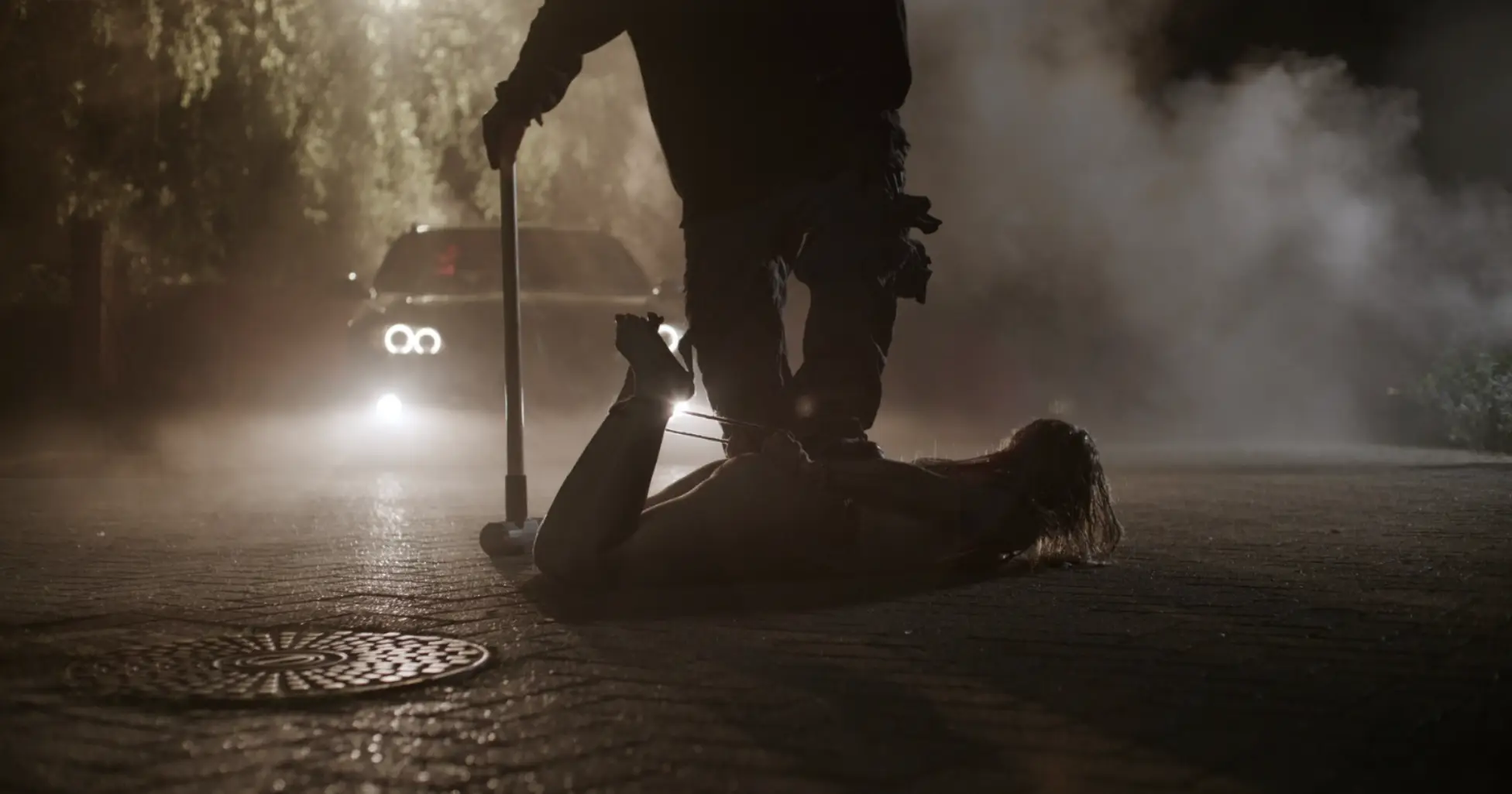 We also see one of the characters standing on what appears to be a kidnapped, tied up woman emphasising that this film is not going to hold back on its sinister essence.