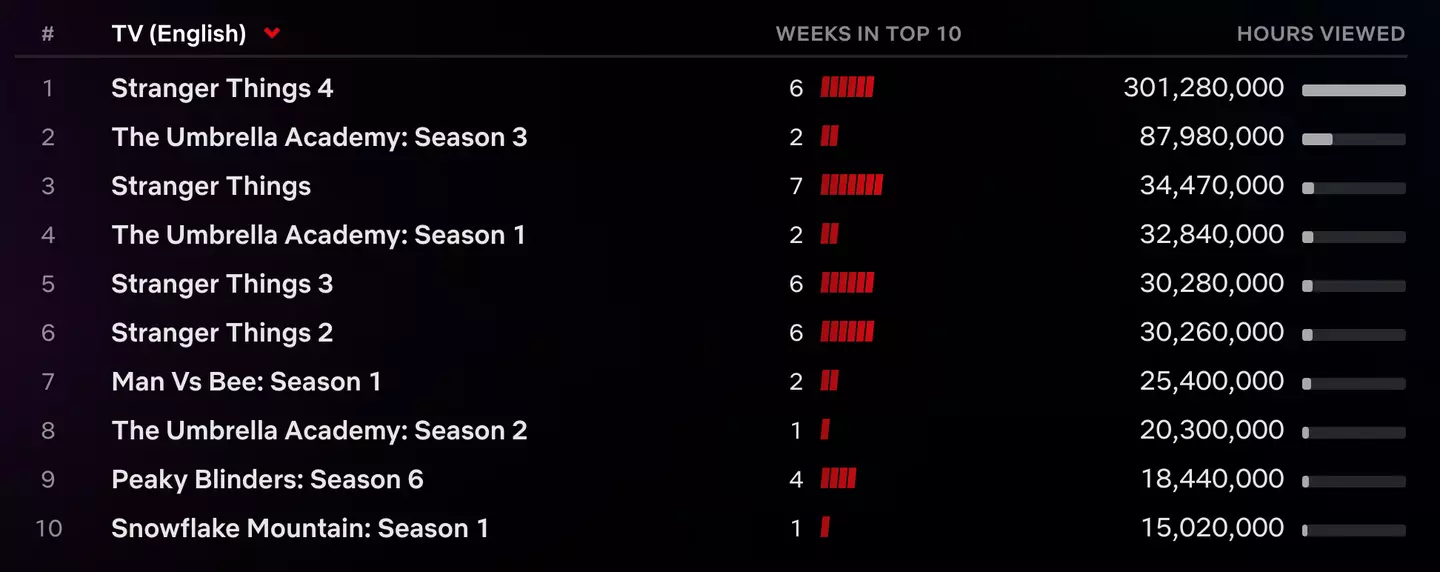 This makes Stranger Things 4 the second most-popular show overall and the highest achieving English-language series ever.
