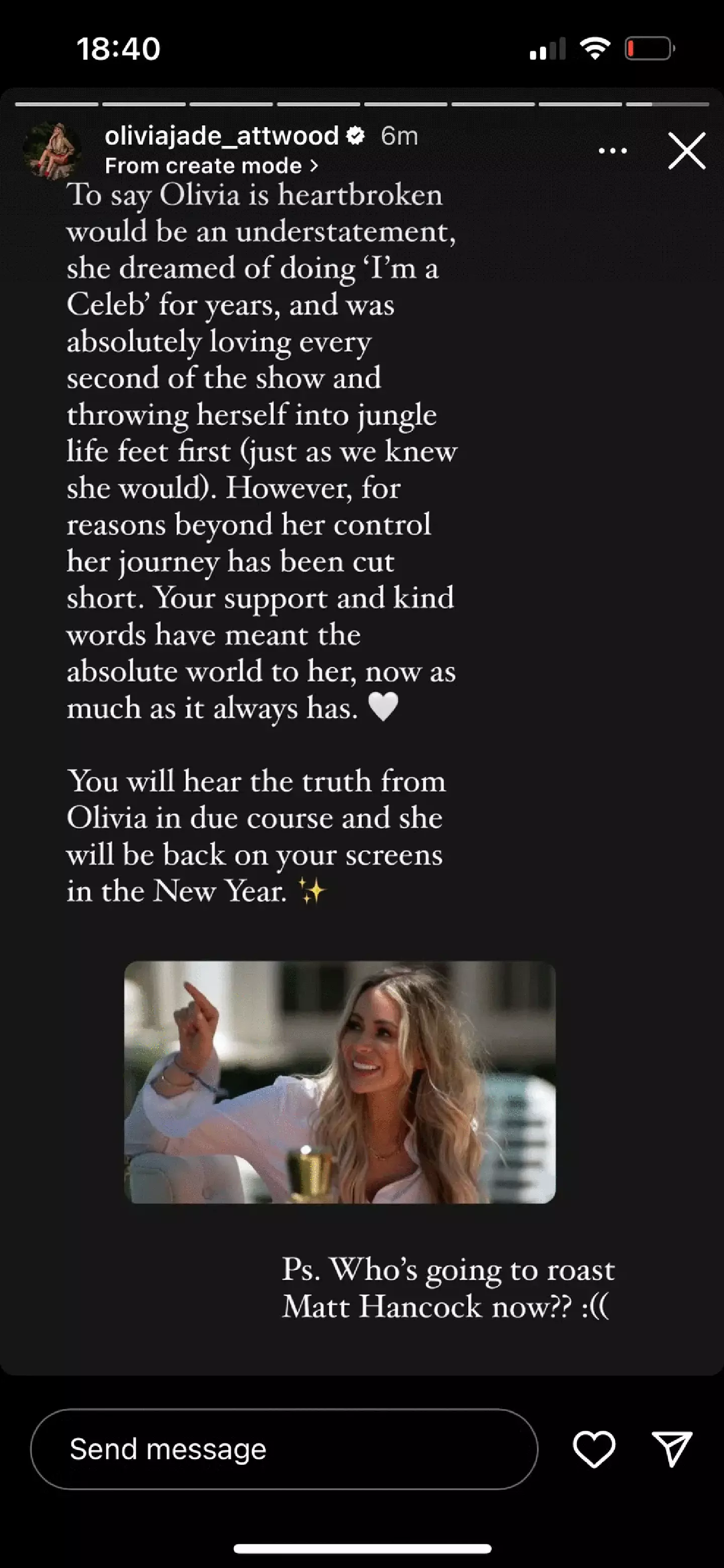It read: "To say Olivia is heartbroken would be an understatement, she dreamed of doing I'm a Celeb for years and was absolutely loving every second of the show and throwing herself into jungle life feet first (just as we knew she would).
