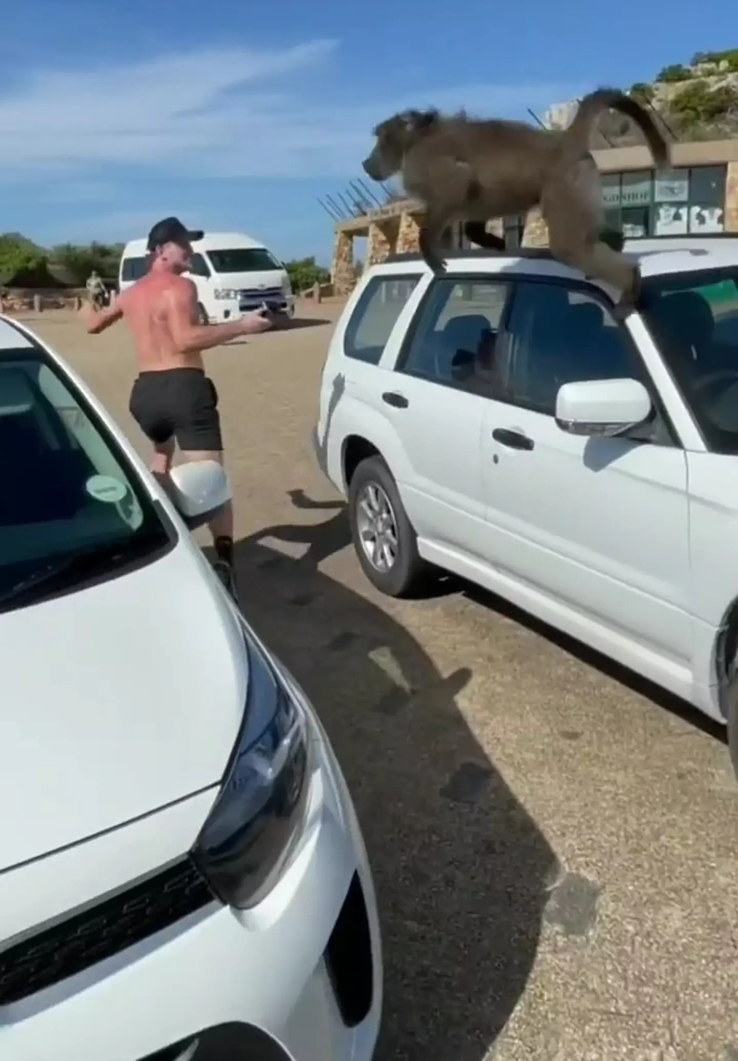 One of the primates then startled the YouTuber by jumping from car to car to intimidate him.