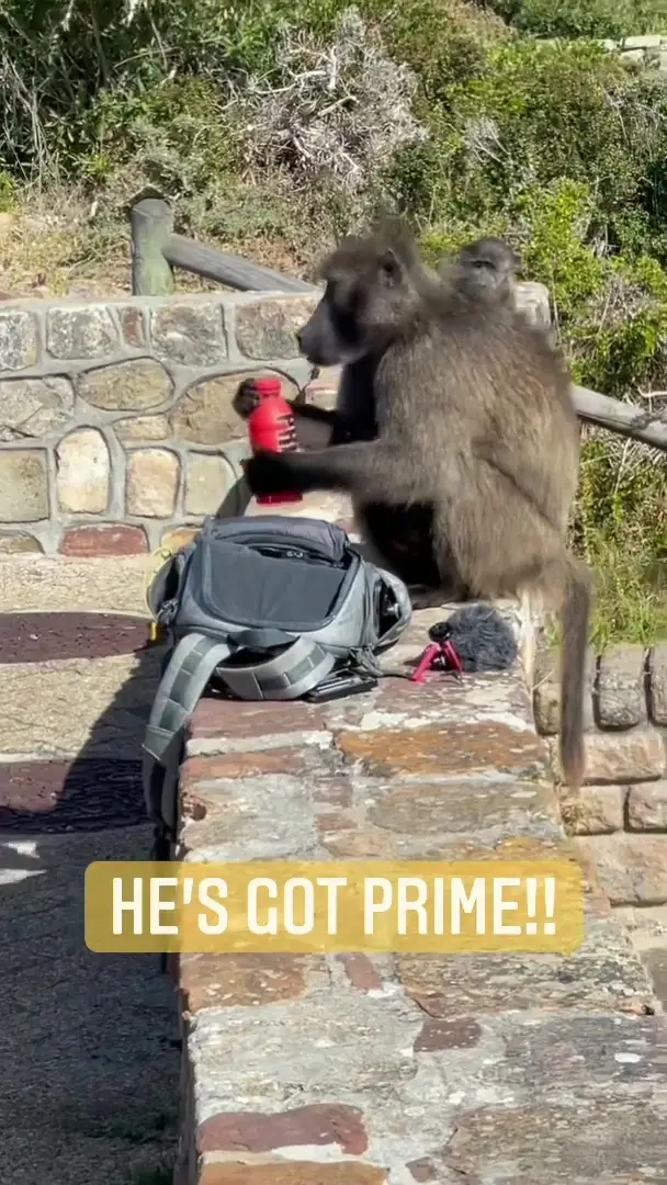 After running its hands through the bag, the baboon runs off with a red 'fruity punch' bottle of the drink.
