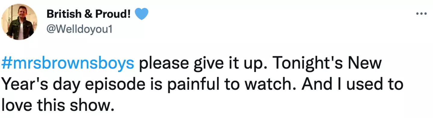 Another viewer dragged the New Year's episode, writing: "#mrsbrownsboys please give it up. Tonight's New Year's day episode is painful to watch. And I used to love this show."