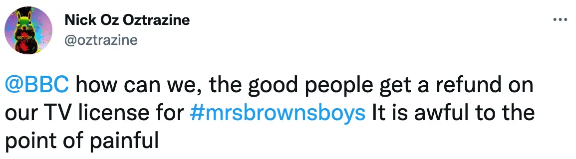 One disappointed fan tweeted: "@BBC how can we, the good people get a refund on our TV license for #mrsbrownsboys It is awful to the point of painful."