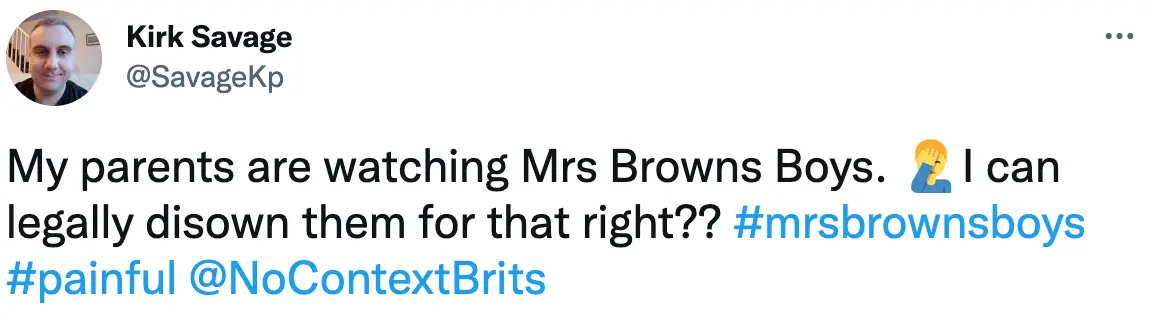 While one man joked: "My parents are watching Mrs Brown's Boys. I can legally disown them for that right #mrsbrownsboys #painful."