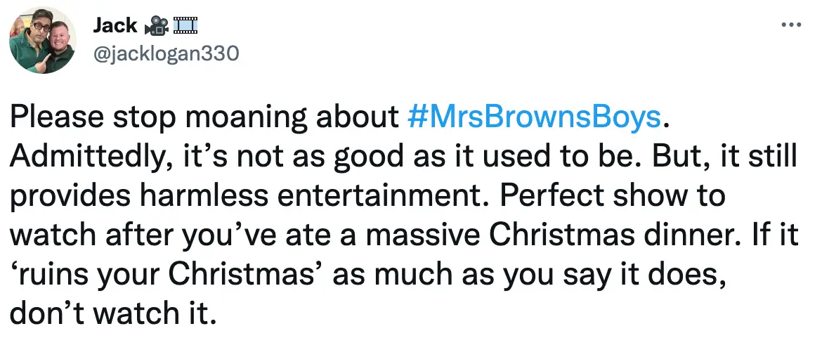 After watching the New Year's special, another fan wrote: "Please stop moaning about #MrsBrownsBoys. Admittedly, it’s not as good as it used to be. But, it still provides harmless entertainment. Perfect show to watch after you’ve ate a massive Christmas dinner. If it ‘ruins your Christmas’ as much as you say it does, don’t watch it."