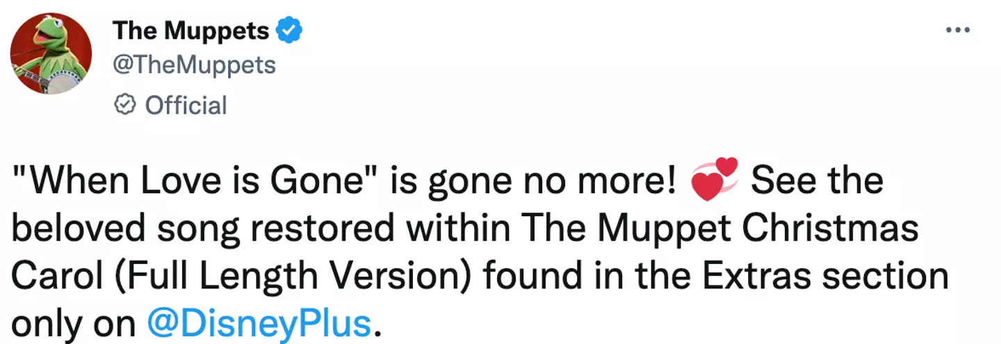 Announcing the news on Twitter, the official Muppets account shared: "'When Love is Gone' is gone no more! See the beloved song restored within The Muppet Christmas Carol (Full Length Version) found in the Extras section only on Disney Plus."
