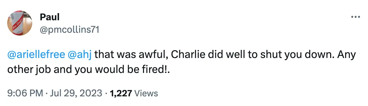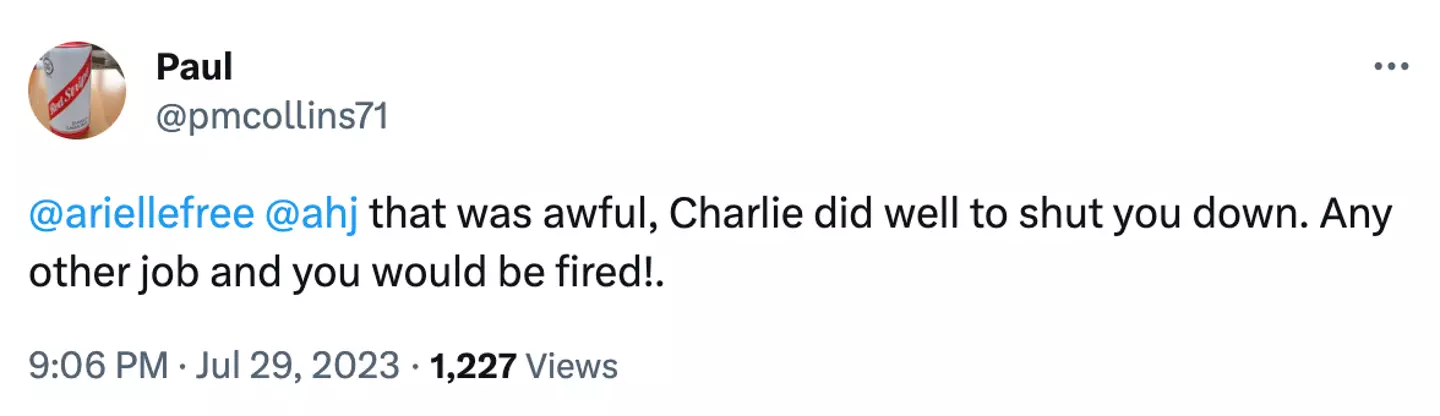A second echoed the praise: "@ariellefree @ahj that was awful, Charlie did well to shut you down. Any other job and you would be fired!"