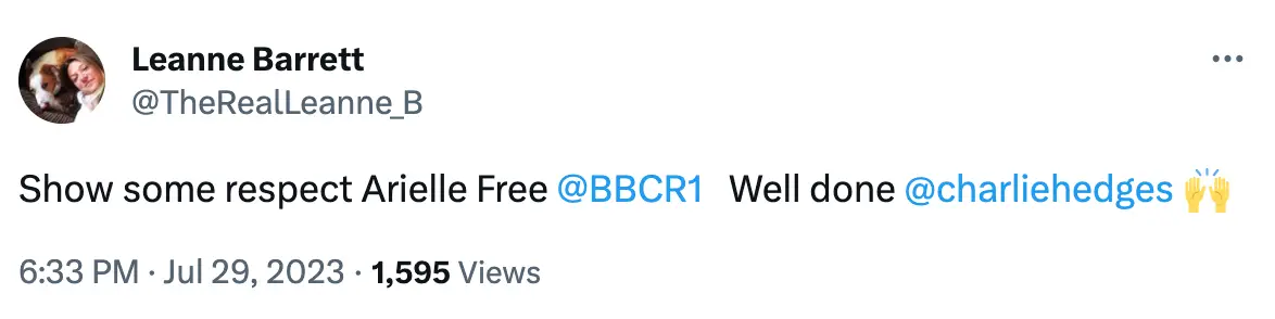 "Show some respect Arielle Free @BBCR1," tweeted a third before adding: "Well done @charliehedges."