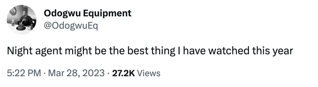 Someone else said: "Whoever on Netflix made The Night Agent should be in charge of content it’s their best in a long time."