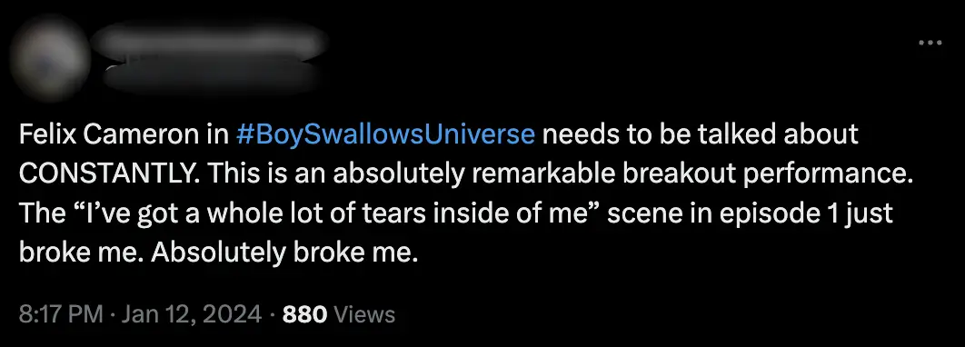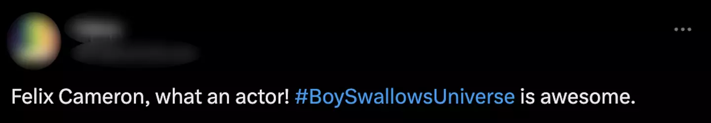 While another commenter had nothing but great things to say about Cameron, writing: "Felix Cameron in #BoySwallowsUniverse needs to be talked about CONSTANTLY. This is an absolutely remarkable breakout performance.