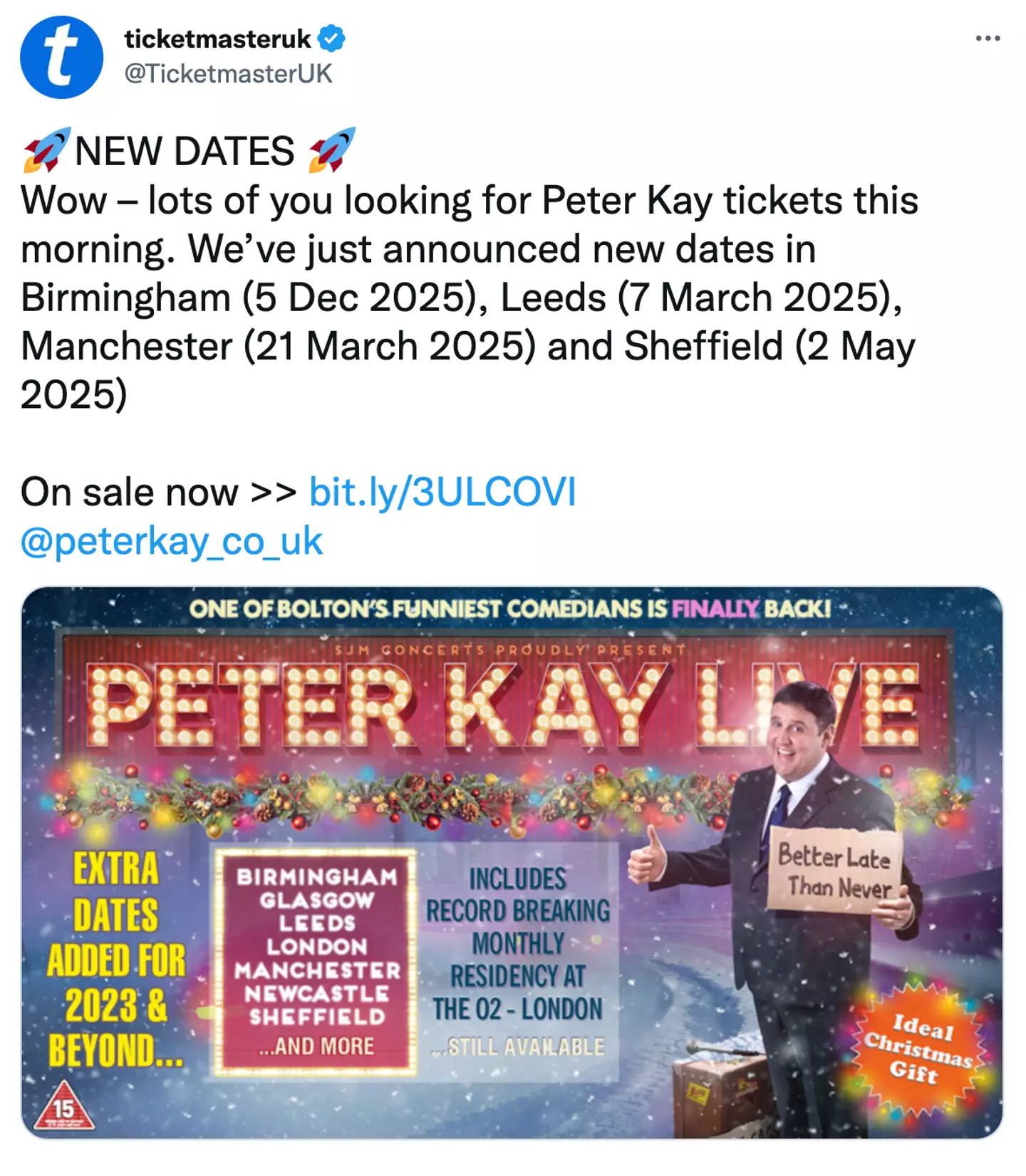 They took to Twitter to announce the news: "Wow – lots of you looking for Peter Kay tickets this morning. We’ve just announced new dates in Birmingham (5 Dec 2025), Leeds (7 March 2025), Manchester (21 March 2025) and Sheffield (2 May 2025)."