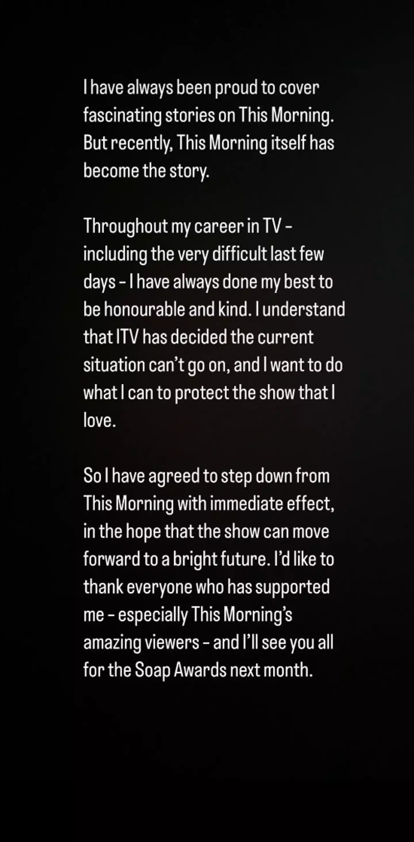 “So I have agreed to step down from This Morning with immediate effect, in the hope that the show can move forward to a bright future. I’d like to thank everyone who has supported me – especially This Morning’s amazing viewers – and I’ll see you all for the Soap Awards next month.”