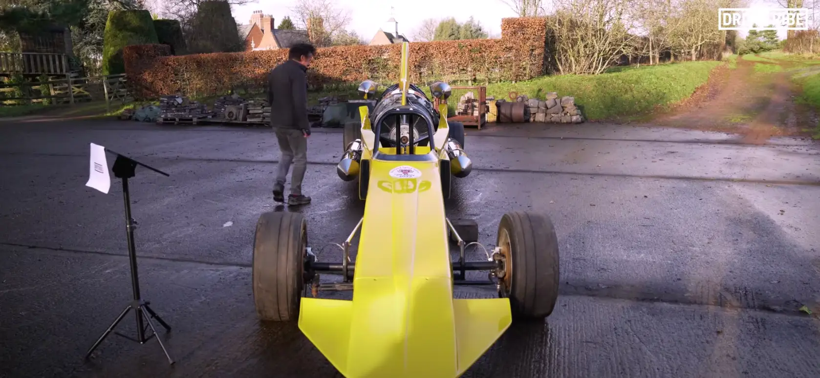 “This year, I shall be doing what I swore I would never do, and get back into the Vampire dragster that so very nearly killed me,” he tells the camera, the corners of the bright yellow car visible behind him.