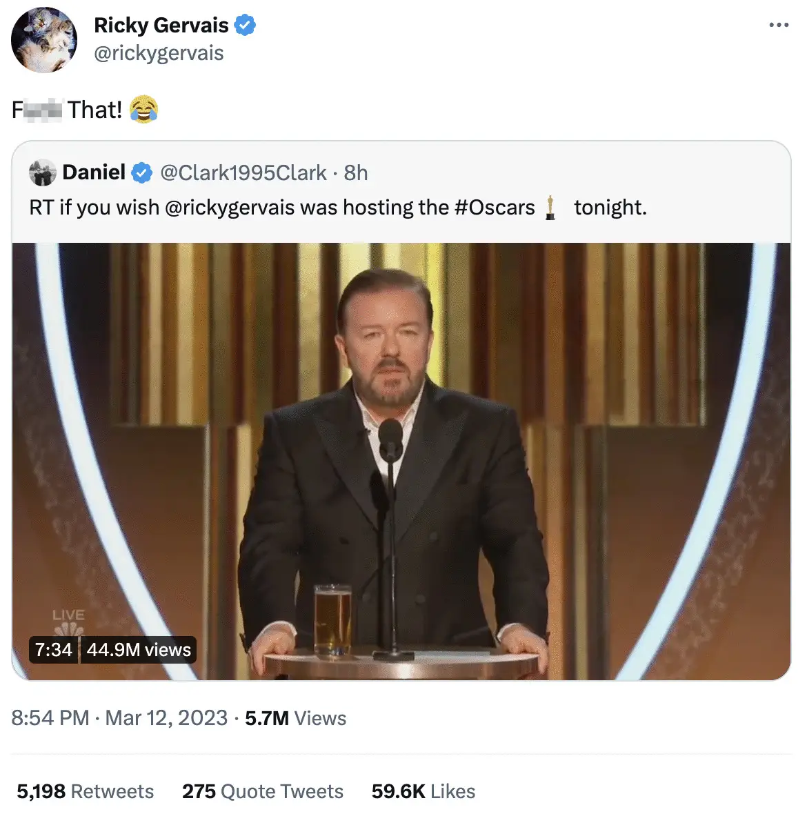 Gervais shared the tweet, writing: “F*** that.”