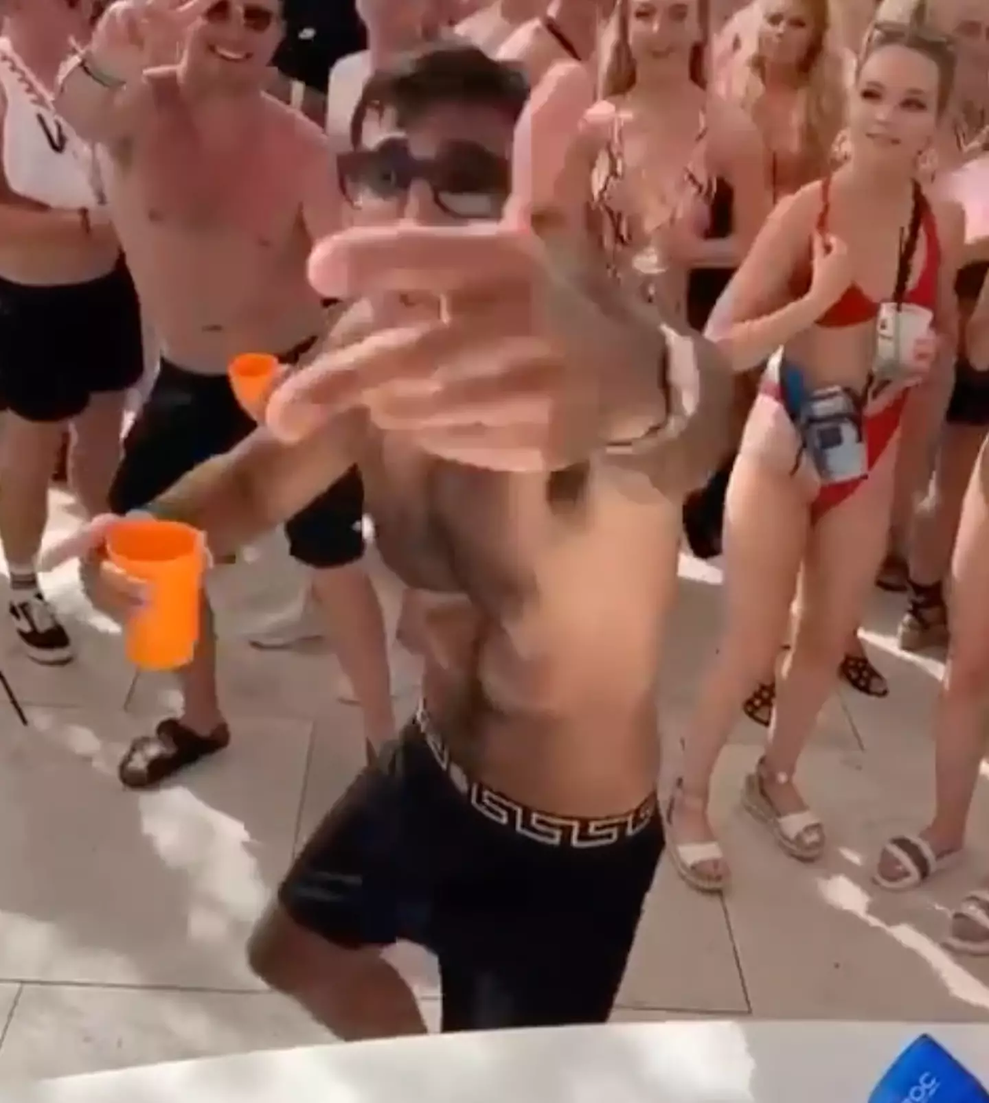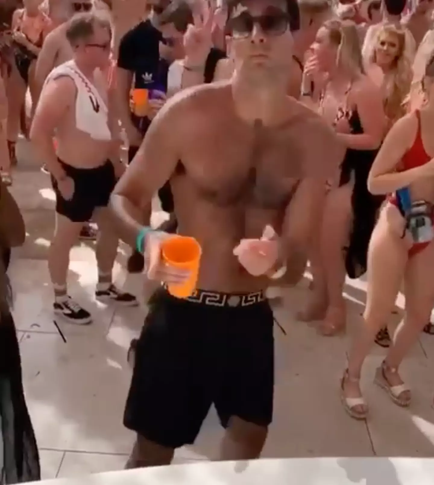 The video shows the man dubbed 'Raving Rishi' wearing some black Versace shorts and sporting a pair of sunglasses with a signature Ocean Beach orange cup in his hand.