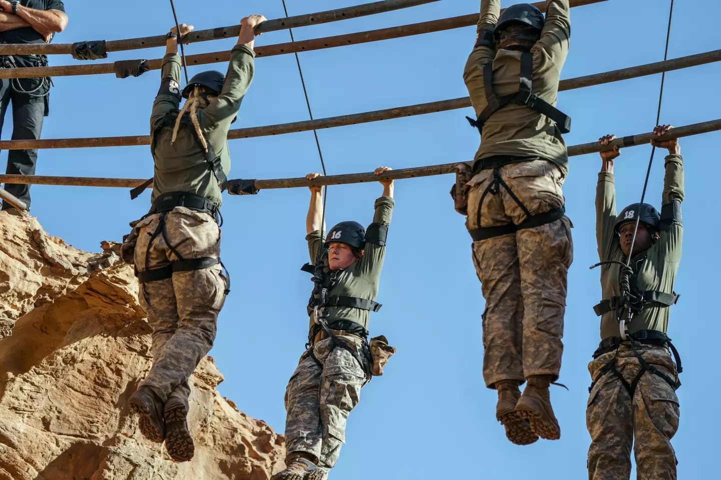 The series then concluded with a final ‘Hang Tough’ challenge, with recruits forced to hang from two bars suspended 50 metres over the ground, using their upper body strength to hold themselves up.