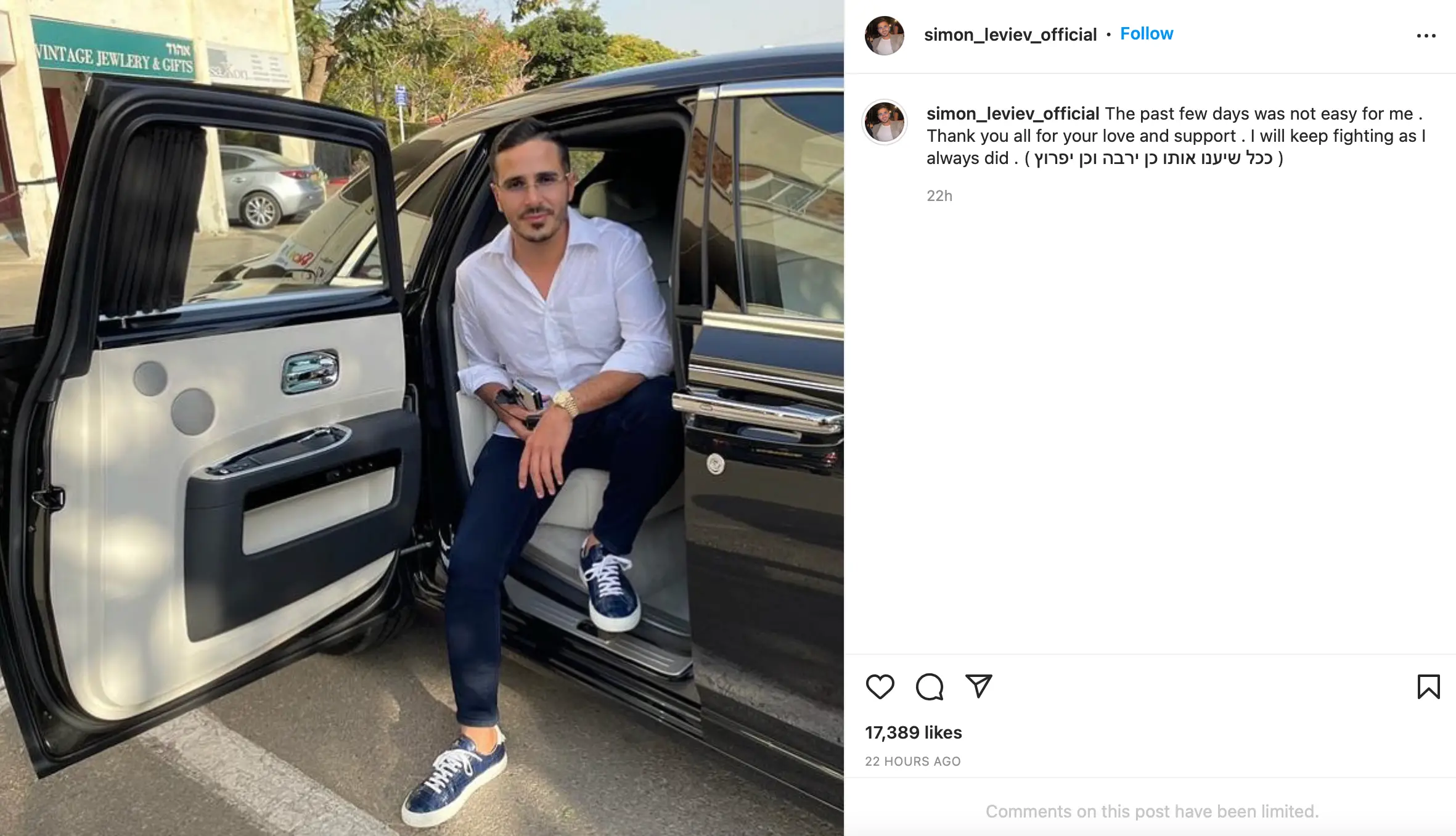 With comments from people set to limited, Leviev - whose real name is actually Shimon Hayut - captioned the post telling people he's been having a tough time.