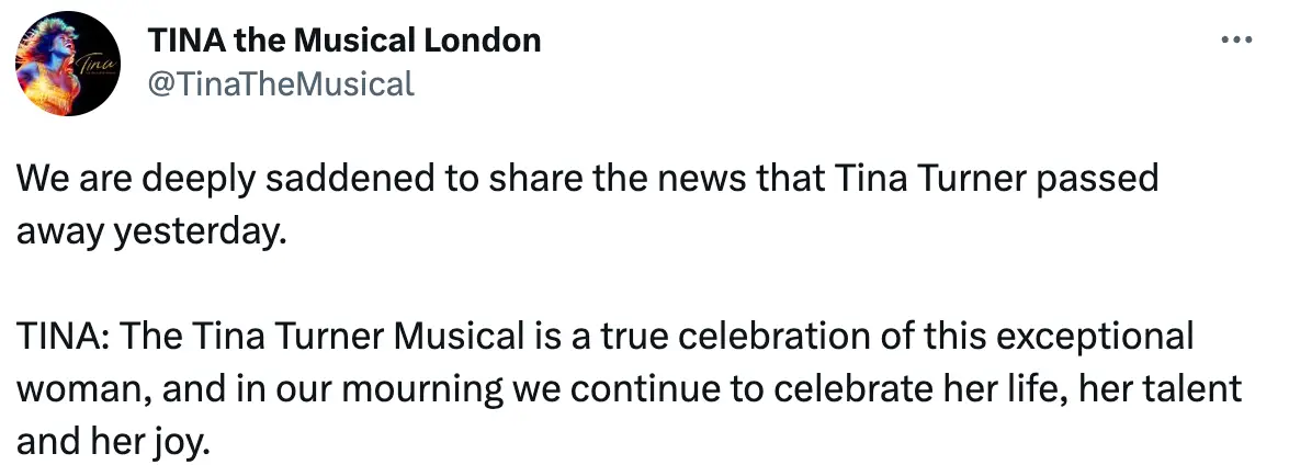"Tina: The Tina Turner Musical is a true celebration of this exceptional woman, and in our mourning we continue to celebrate her life, her talent and her joy."