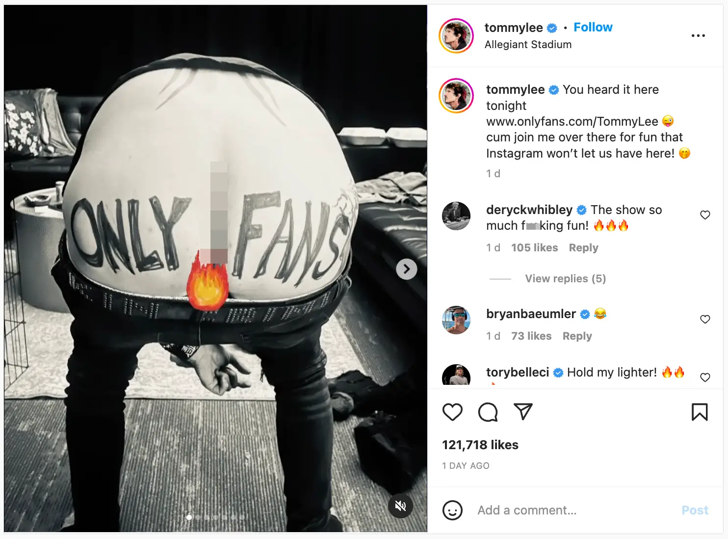 The caption read: "You heard it here tonight www.onlyfans.com/TommyLee cum (sic) join me over there for fun that Instagram won’t let us have here!"