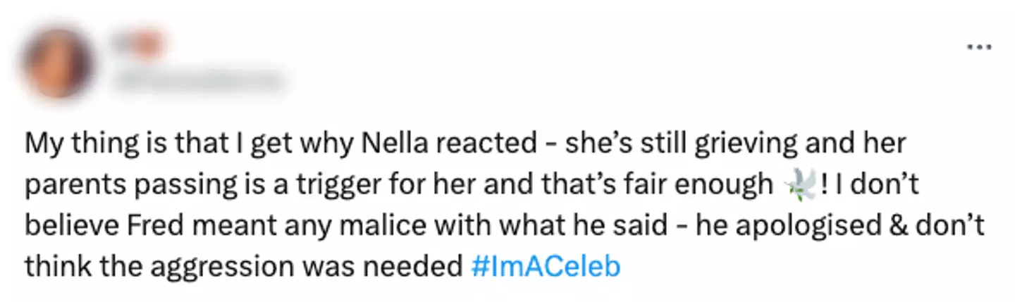 Another said: "As someone who lost my dad at 24, I literally cannot see how what Fred said to Nella is even remotely offensive! I can't work it out!"