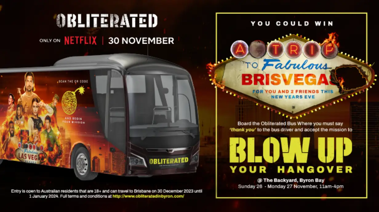 To celebrate the launch of the wild-action-packed comedy series, Netflix is sending an ‘Obliterated Hangover’ bus to The Backyard in Byron on November 26 and 27.