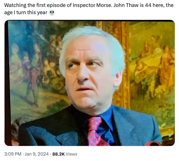"Watching the first episode of Inspector Morse. John Thaw is 44 here, the age I turn this year," they wrote alongside of screenshot of Thaw on the show.