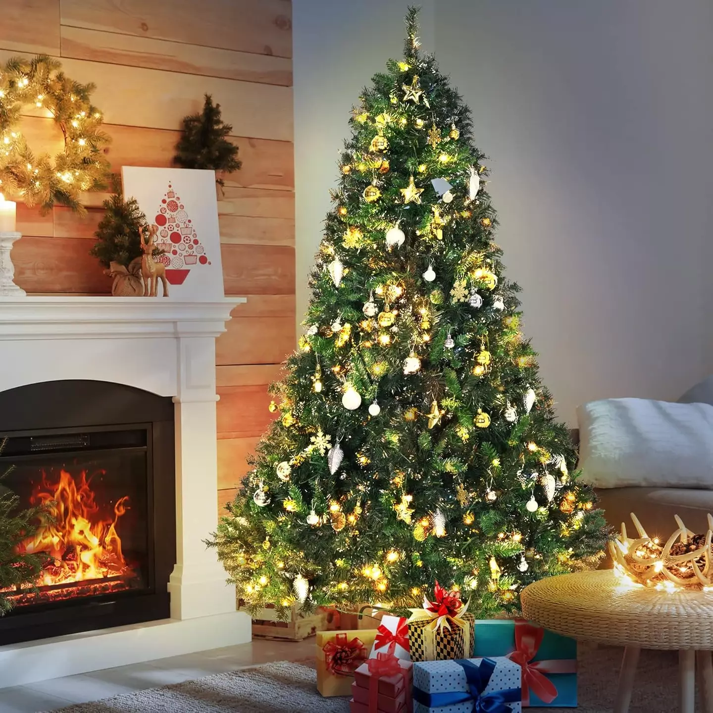 Not only does this artificial masterpiece come pre-lit with 200 warm LED string lights, but its 745 branch tips also come pre-decorated with golden stars, traditional baubles and even seasonal snowflakes.