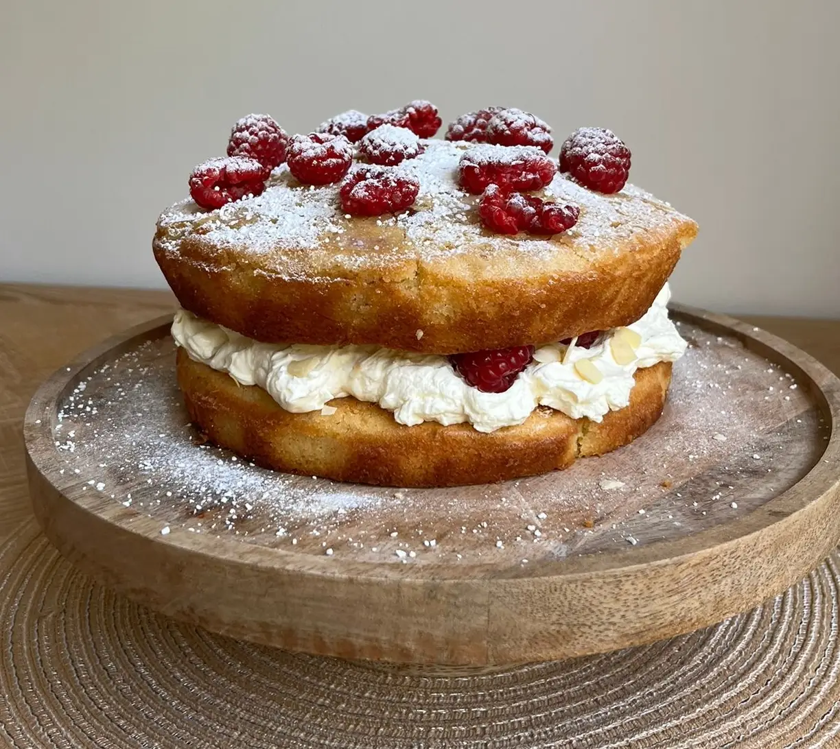I challenged myself to bake a moderately difficult (for me) lemon, almond and raspberry Victoria sponge, made up of two layers of cake and a cream filling.