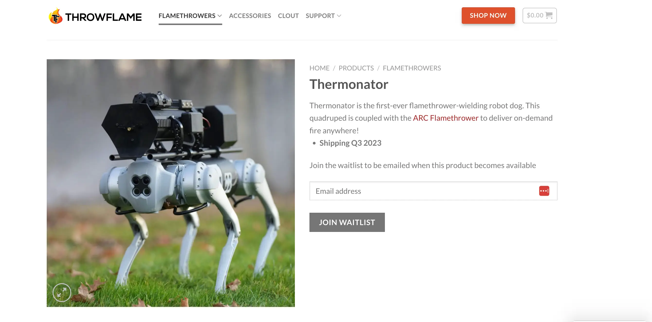“Thermonator is the first-ever flamethrower-wielding robot dog. This quadruped is coupled with the ARC Flamethrower to deliver on-demand fire anywhere,” the website reads.