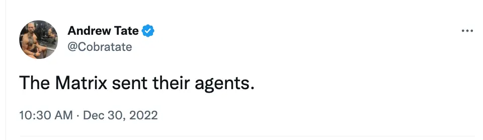 Tate has now posted on his official Twitter account for the first time since his detainment, writing: “The Matrix sent their agents.”