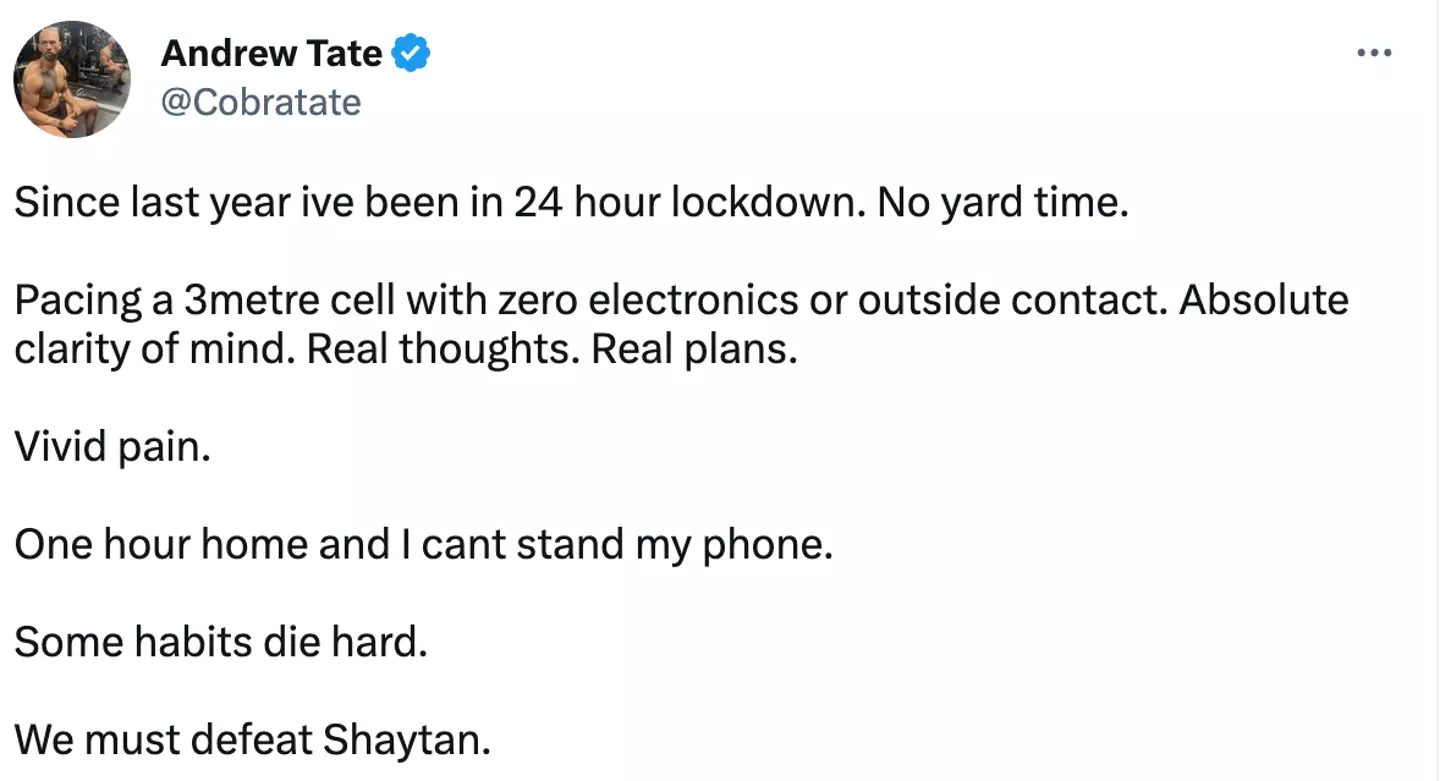 Finally getting a break from the intense conditions of the Romanian prison, it was impossible to predict what Tate, 36, would do first. And, well, this is what he decided to go with: