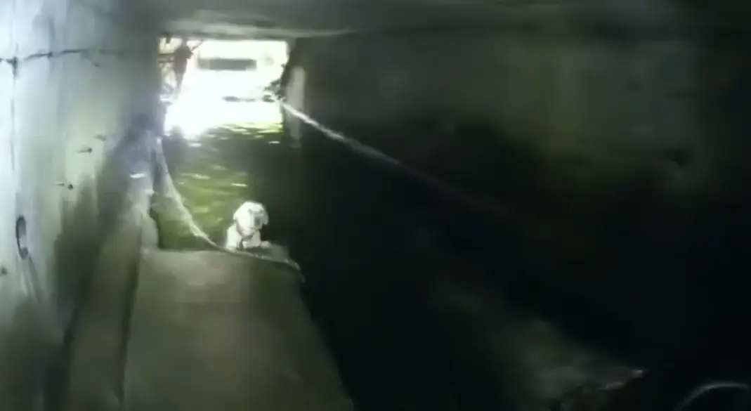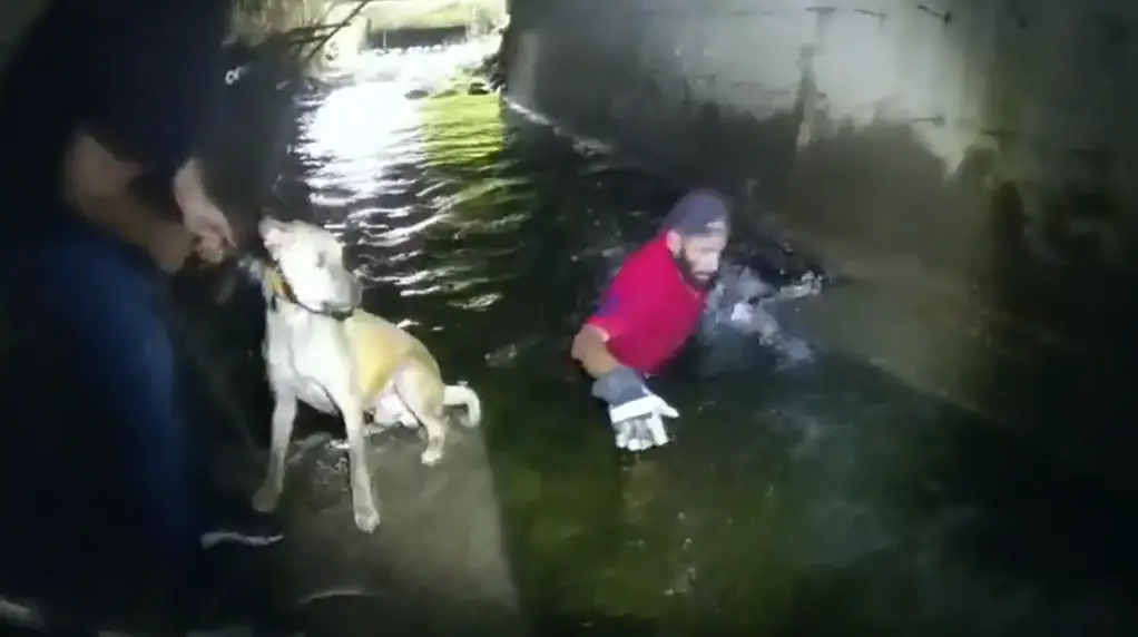 A video shared by the police department shows officers locating the dogs about 40 feet into the tunnel. One of the dogs can be seen clinging to a concrete ledge in multiple feet of water, unable to jump up. The other remained with the trapped dog and barked.