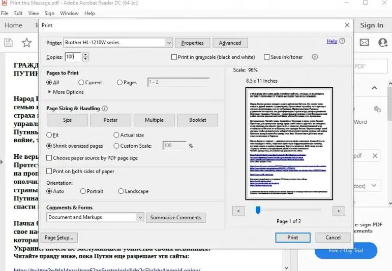 A member of the collective, whose Twitter handle is @DepaixPorteur, tweeted: "We have been printing anti-propaganda and tor installation instructions to printers all over [Russia] for 2 hours, and printed 100,000+ copies so far. 15 people working on this op as we speak."