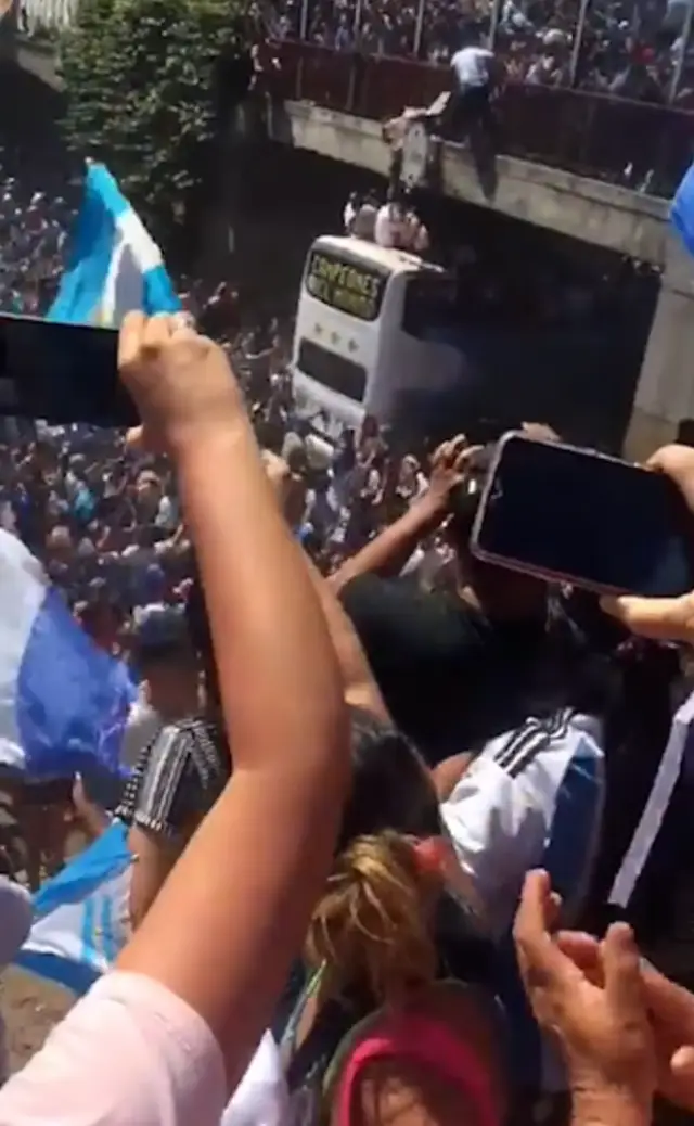 An Argentina fan was filmed leaping from a bridge during a failed attempt to land on the team bus for the World Cup winners.