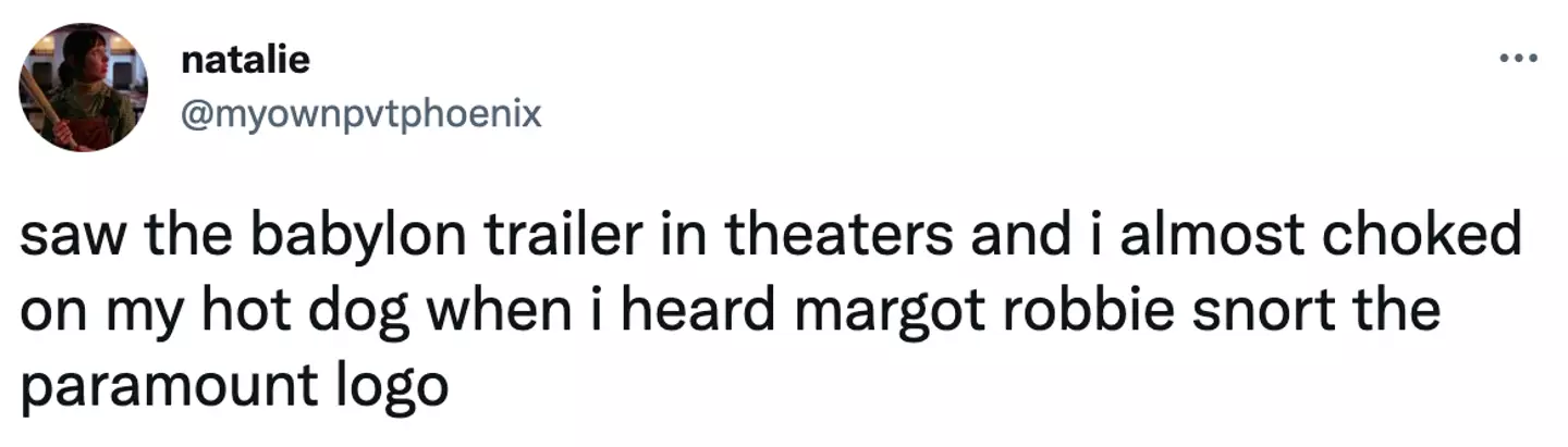 While a fourth Twitter user took to social media after watching the trailer at the cinema, writing: “Saw the Babylon trailer in theatres and I almost choked on my hot dog when I heard Margot Robbie snort the Paramount logo.”
