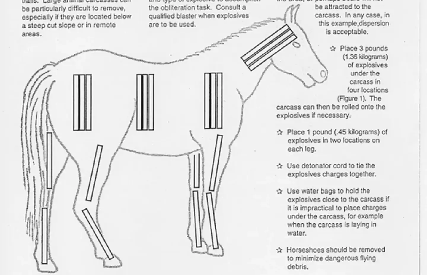 In cases where it's not possible to get explosives underneath the carcass, they recommend laying a hell of a lot more explosives on top of the horse.