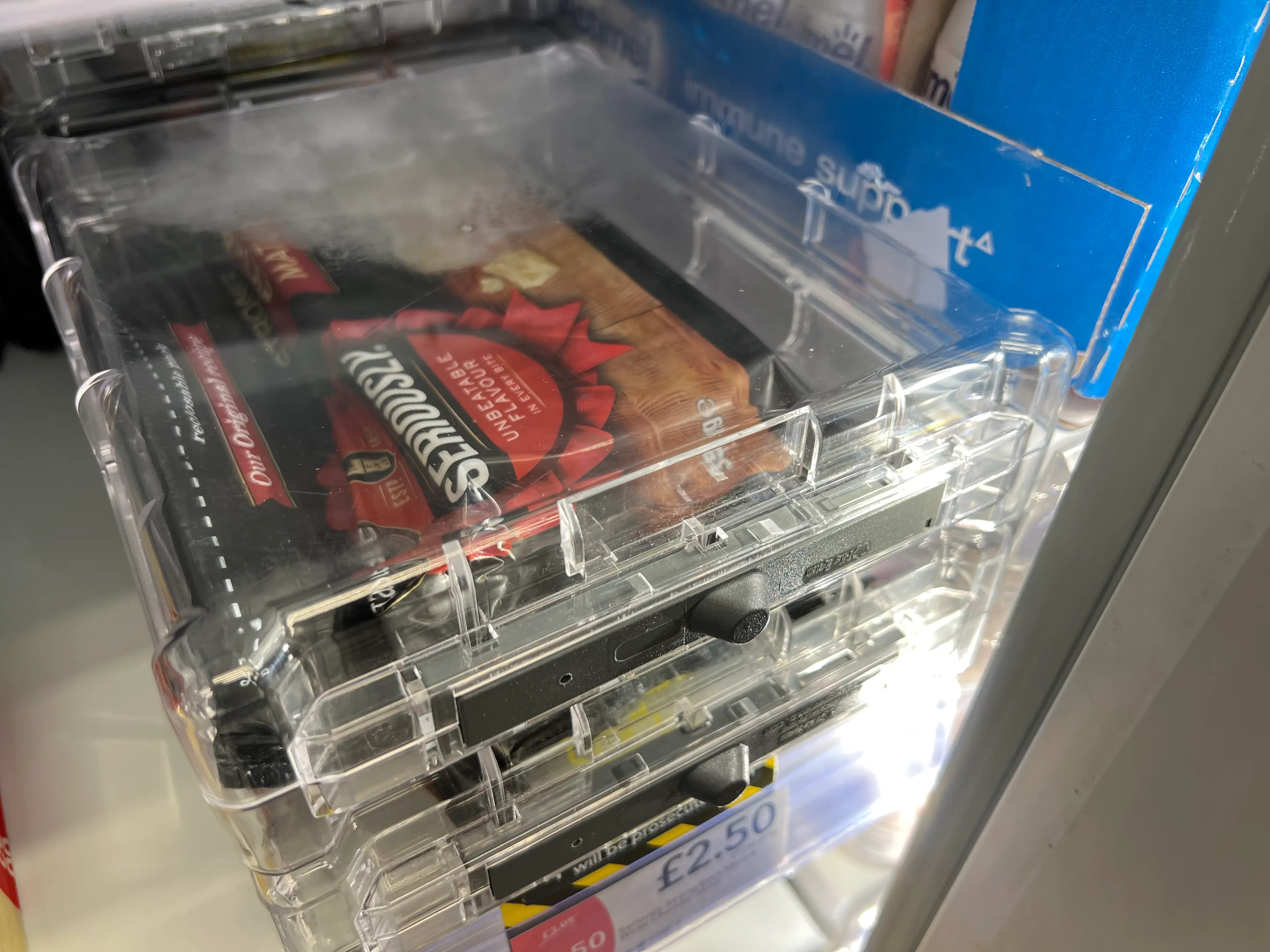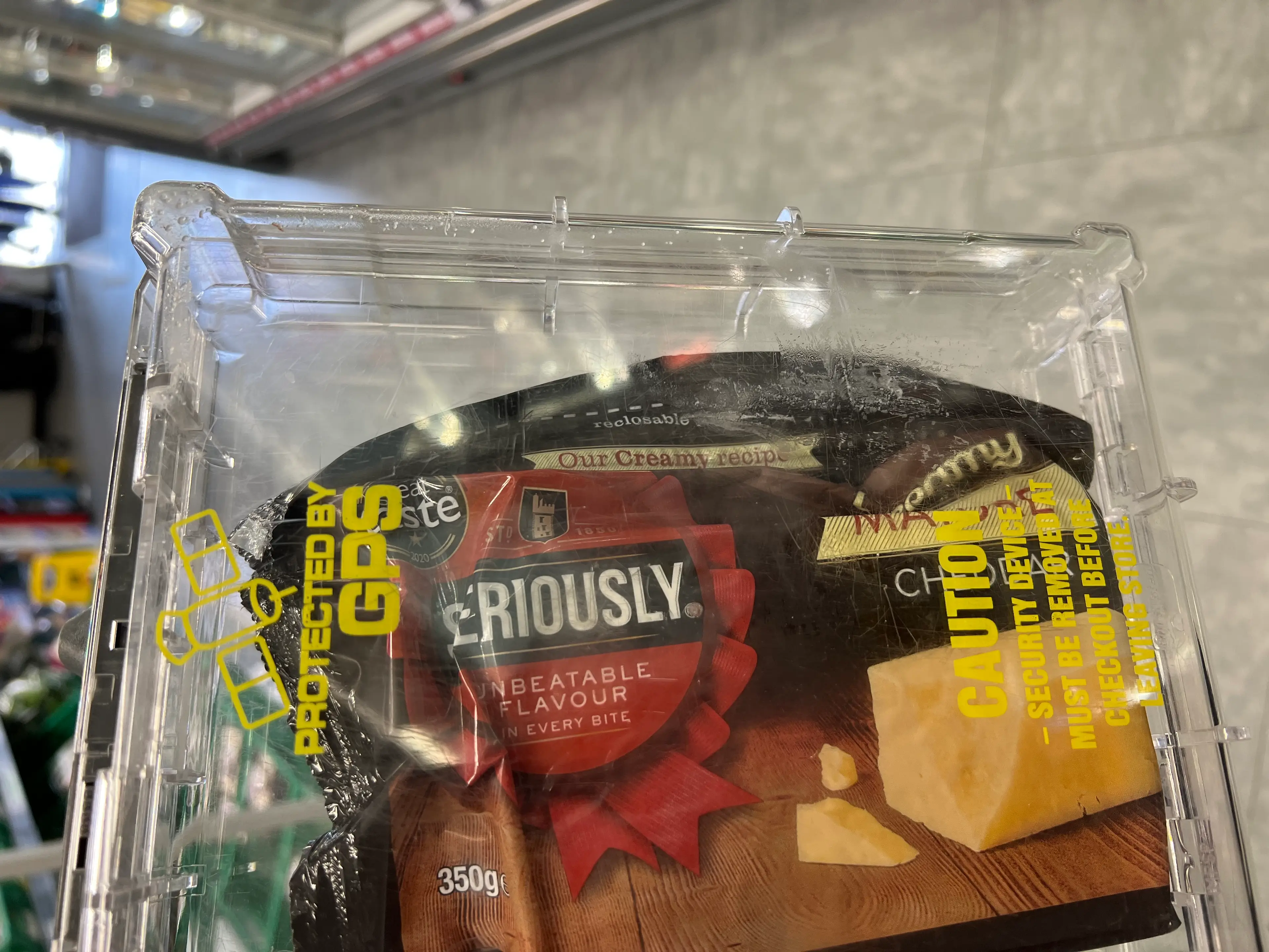 Packets of cheese are being displayed in secure plastic cases at a supermarket in Stoke-on-Trent in a bid to stop light-fingered fromage fans from stealing them.