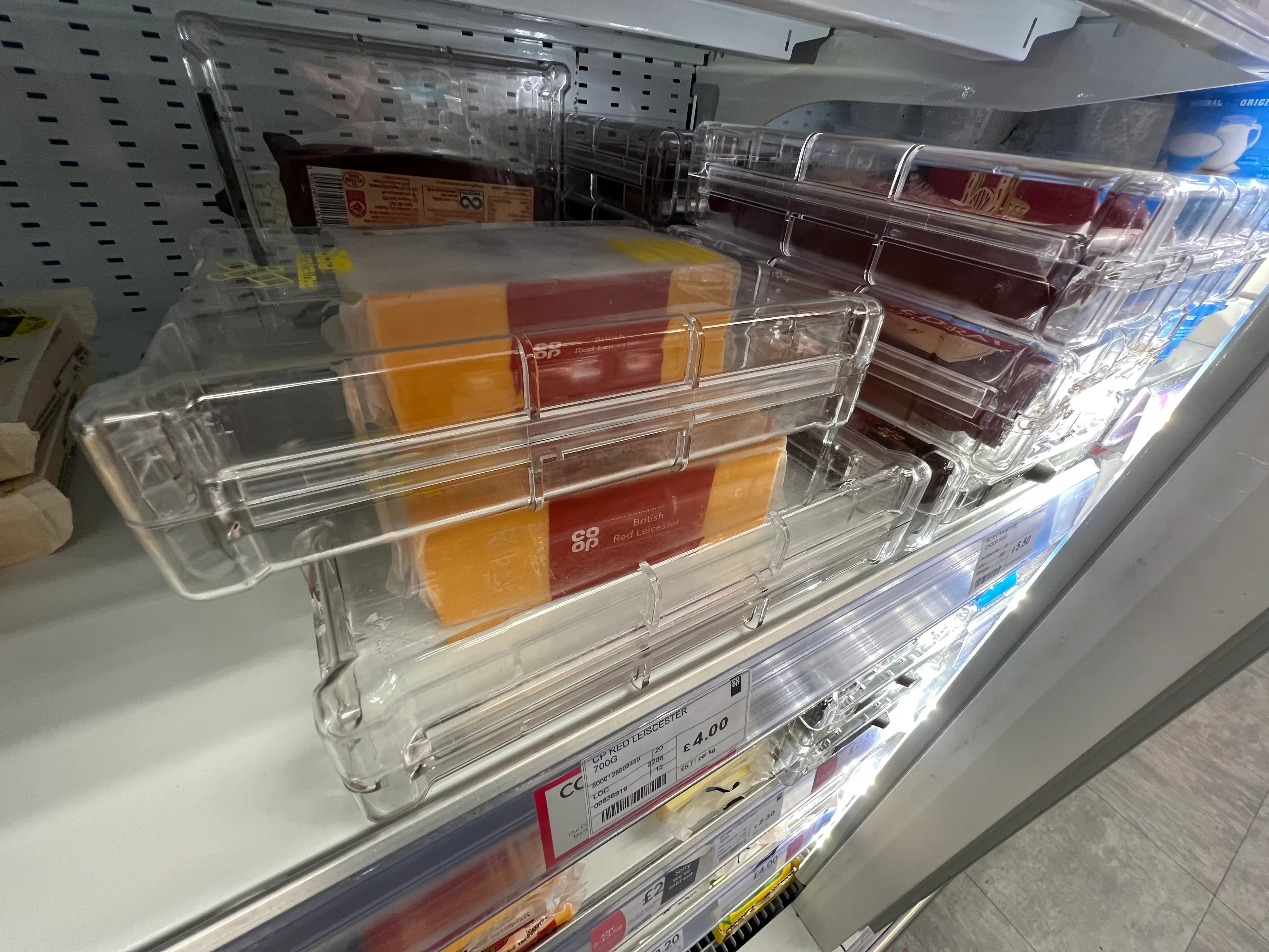 Images show how the cases have been used to lock up items including blocks of Cathedral City Cheddar, costing £2.50, and Co-op's own Red Leicester, which costs £4.00, at the store in Bentilee - where other products like meat are also stored in the plastic boxes.