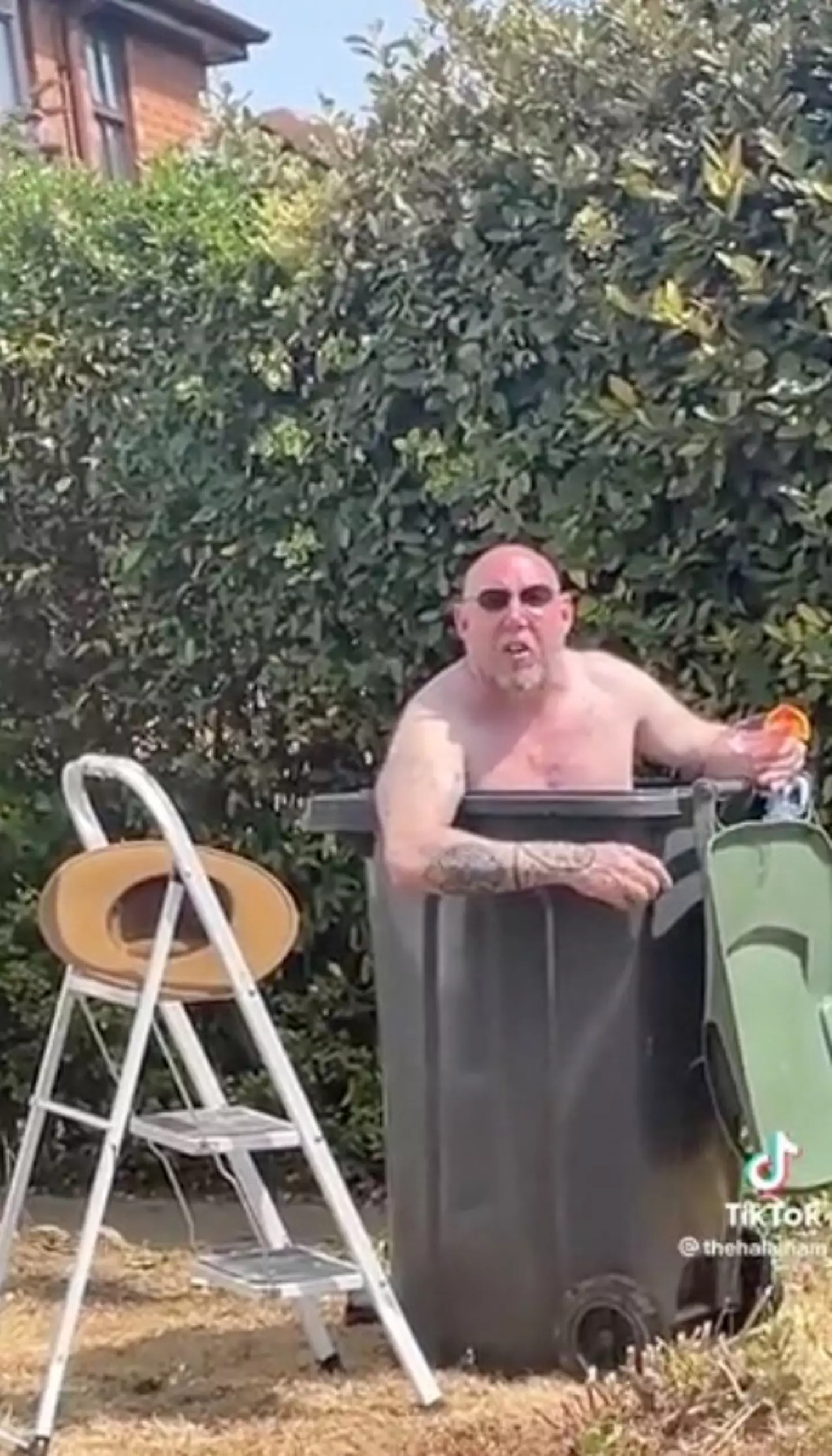 In what's the most bizarre video you'll see this year, a man is casually sitting in a bin – which he's using as a swimming pool – while simultaneously having a bicker with his neighbour.