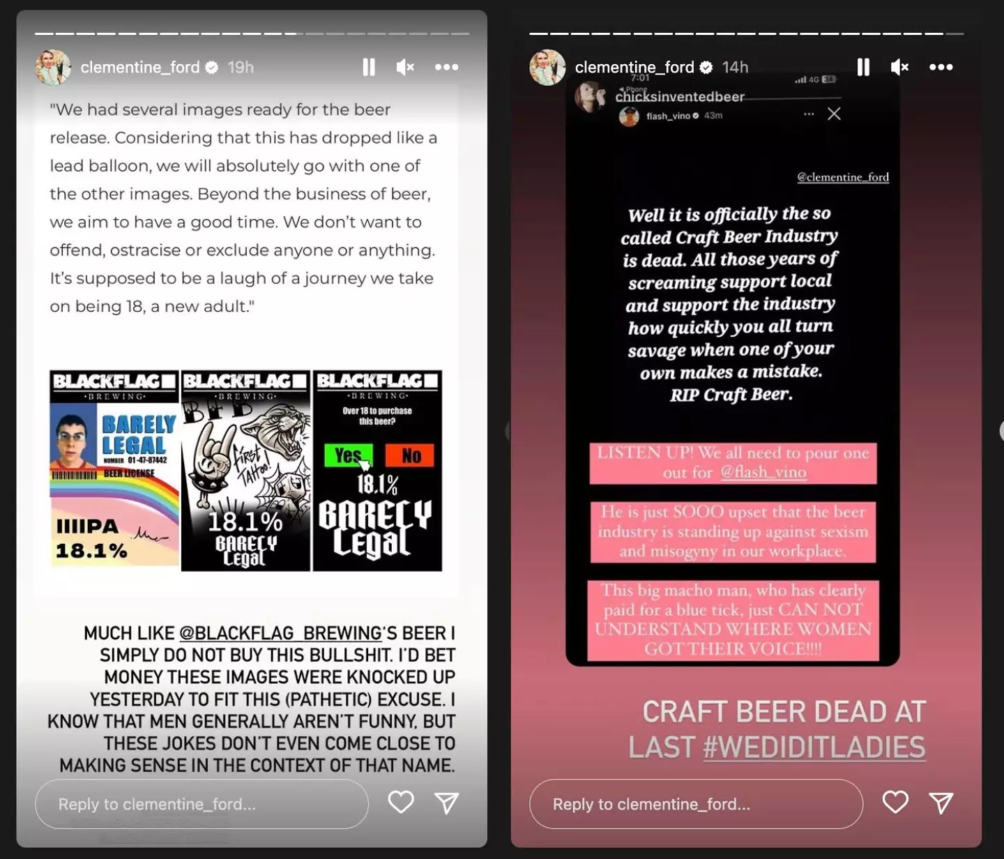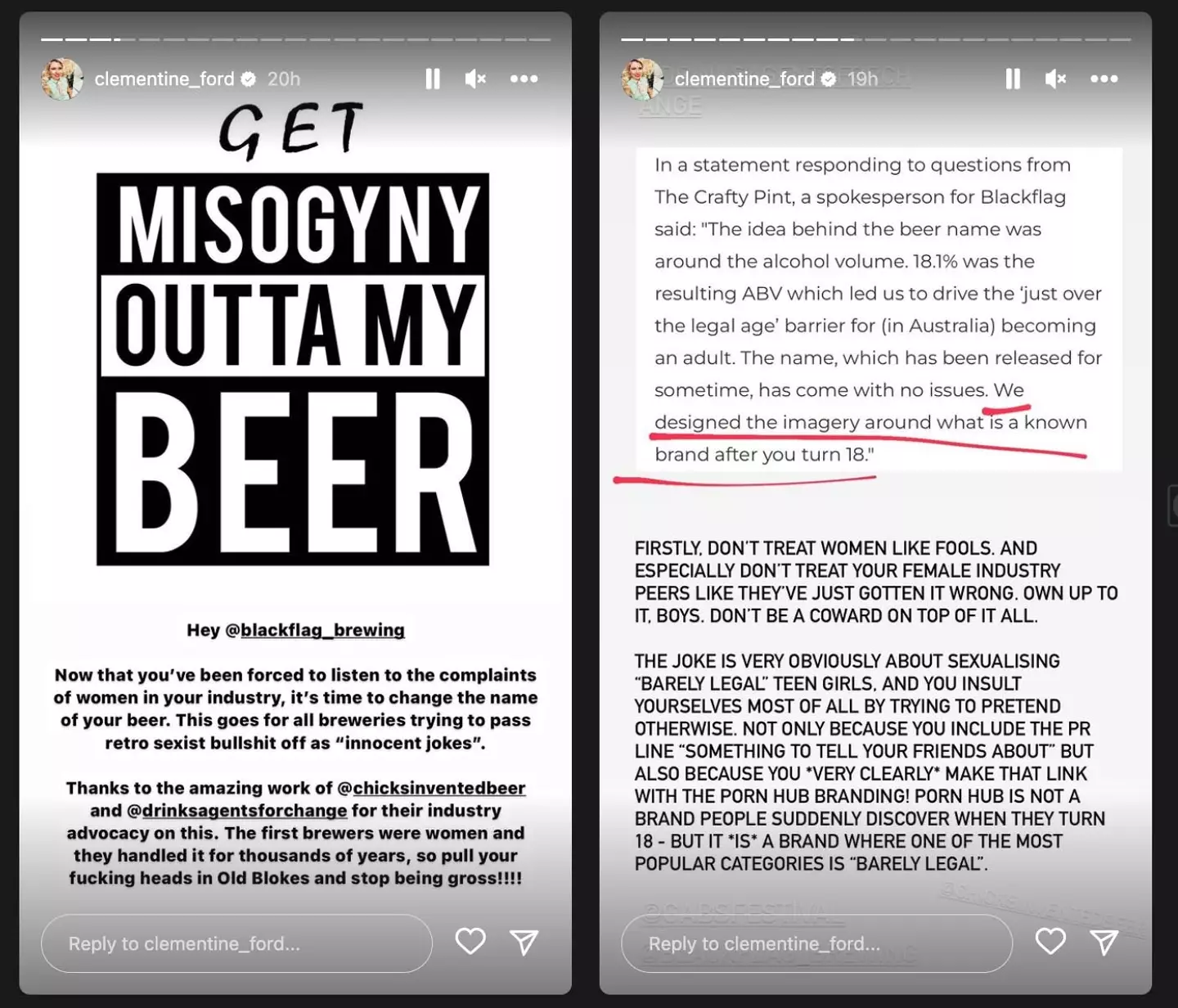 Instagram page 'Chicks Invented Beer' also took aim at the company's branding in an Instagram story, stating that the name 'creates a culture where sexism and sexualising minors is not only accepted but celebrated'.