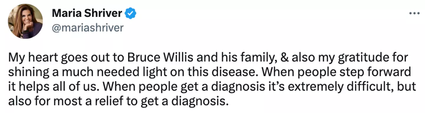 "My heart goes out to Bruce Willis and his family, & also my gratitude for shining a much needed light on this disease," she tweeted. "When people step forward it helps all of us. When people get a diagnosis it’s extremely difficult, but also for most a relief to get a diagnosis."
