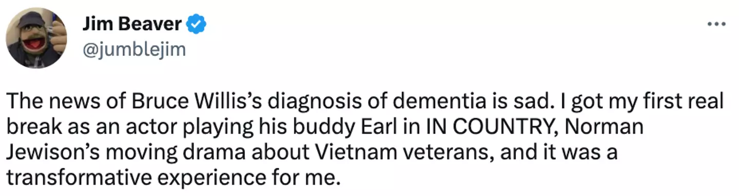 Supernatural actor Jim Beaver tweeted: "The news of Bruce Willis's diagnosis of dementia is sad. I got my first real break as an actor playing his buddy Earl in IN COUNTRY, Norman Jewison's moving drama about Vietnam veterans, and it was a transformative experience for me."