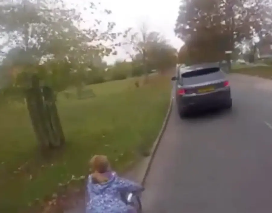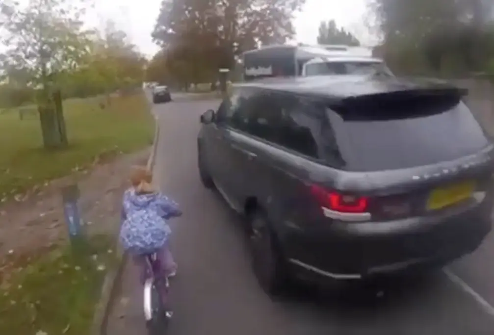 In the clip, the young cyclist can be seen riding without a helmet as the large black Range Rover passes her and heads off into the distance.