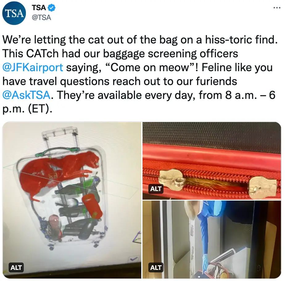 TSA spokesperson Lisa Farbstein told NBC News: “The cat did not belong to the individual with the suitcase, it belonged to someone else in the household.” The plot thickens.