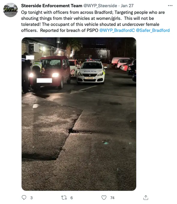 A 27 January tweet by the enforcement team about the incident read: "Targeting people who are shouting things from their vehicles at women/girls.This will not be tolerated.
