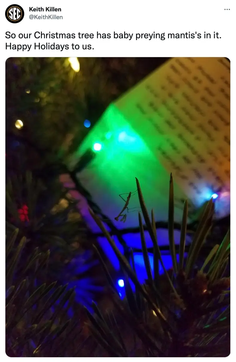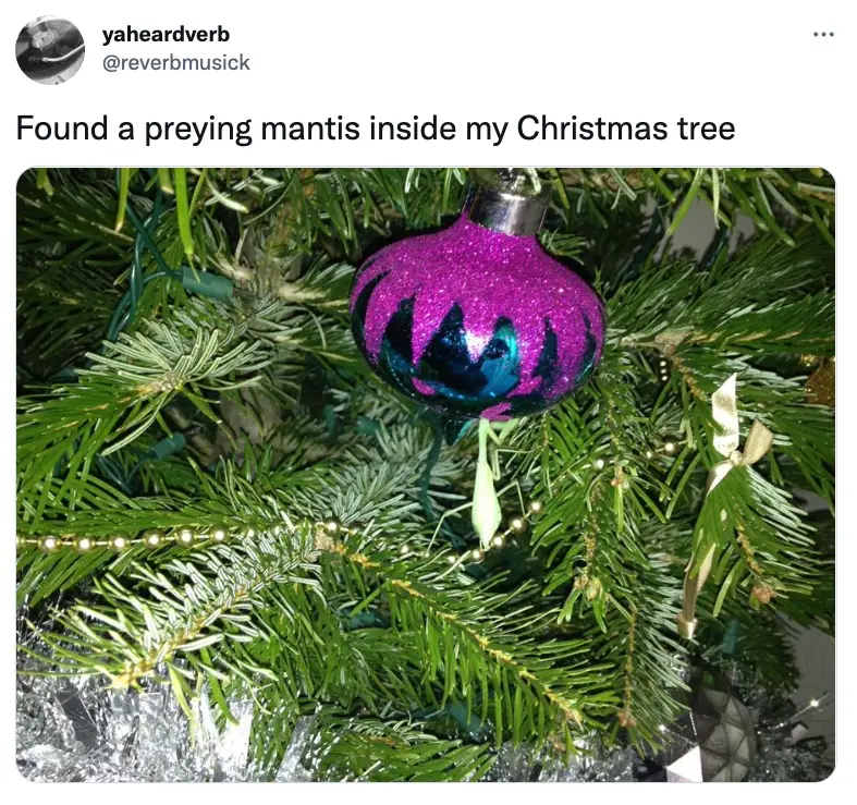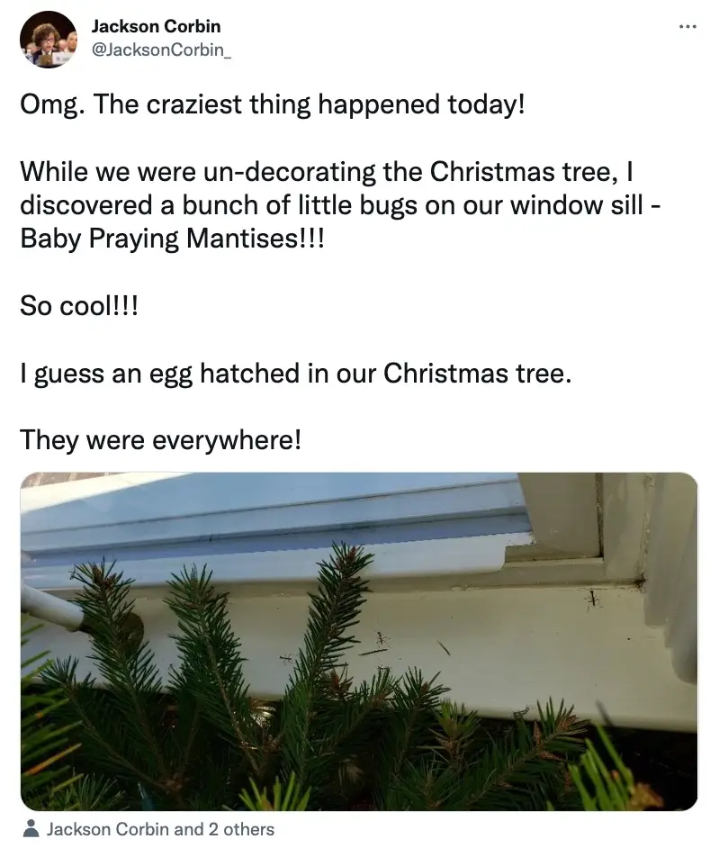Another chimed in: "An unexpected turn in my coup day was discovering that the Christmas tree had brought in an eggsack of praying mantises (that had since hatched).