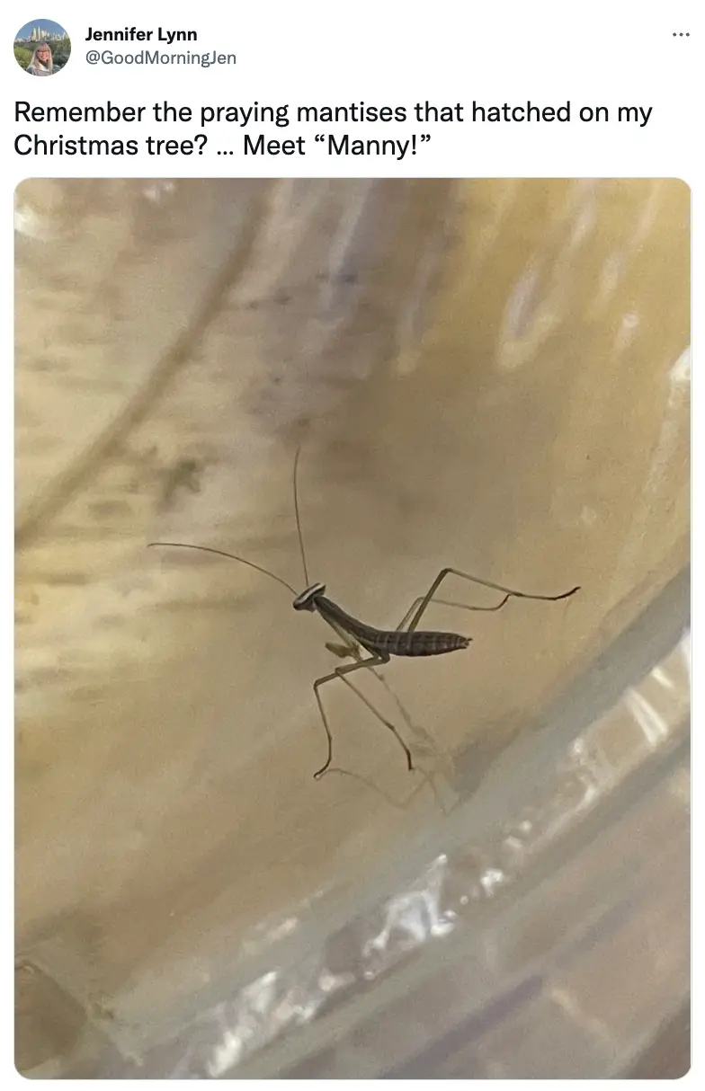 "Remember the praying mantises that hatched on my Christmas tree? Meet 'Manny'," they wrote.