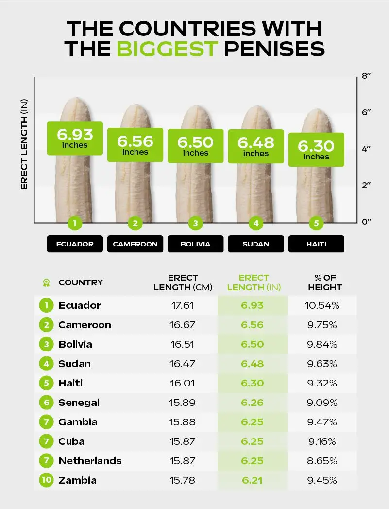 According to the study, men in Ecuador are the most well-endowed, with an average penis size of 6.93 inches when erect. This makes the measurement more than 10 percent of the average height.