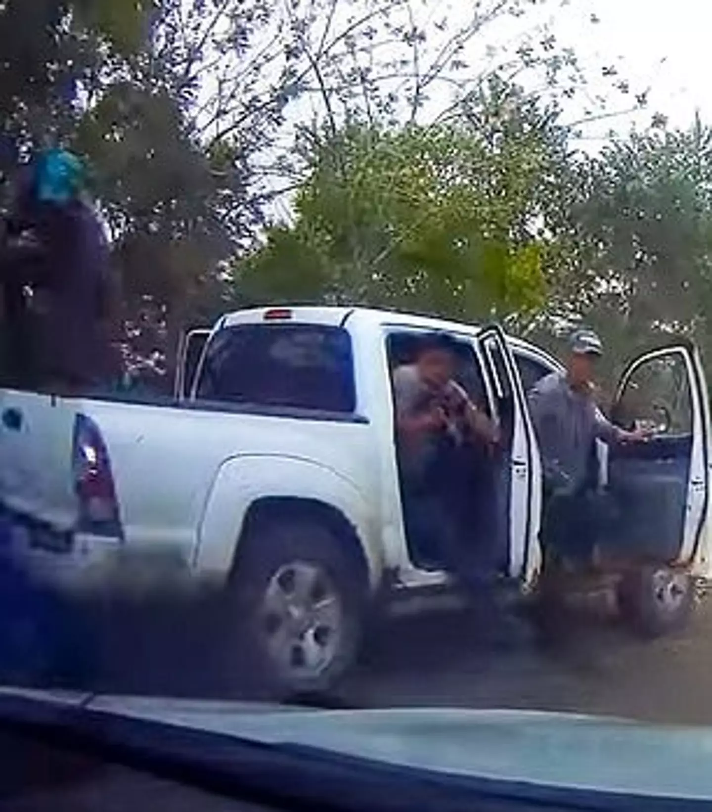 The frightening footage was captured while the couple were driving down a dirt road and noticed a pick-up van approaching their vehicle quickly.