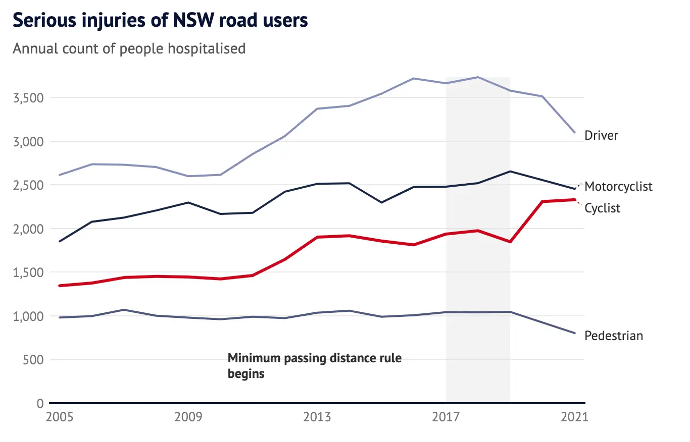 According to Transport for NSW, 2330 cyclists were taken to hospital back in 2021, which is the highest number since 2005.